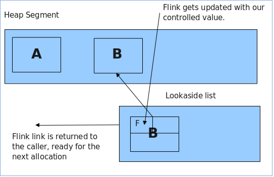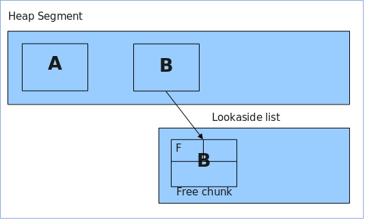 // Freeing of chunk B: the chunk gets referenced to the lookaside list