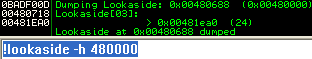 We can see that we have two allocated chunks in the segment 0x00480000 at the size of 0x18. If we subtract 0x8 bytes from that value we are left with 0x10 or 16 bytes. Lets take a look at the lookaside and see if we actually freed chunk (B) too that location.