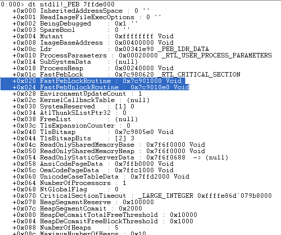 At this point, the code will access violate on a READ operation. When attacking an application using this technique, we would replace the 0x44444444 with a function pointer (faking flink). Now, when the heap manager creates the next allocated chunk, the application will write at the location of the fake flink. We would now allocate chunk C and fill the buffer with arbitrary shellcode. The idea at this point is to have our function pointer called before the application crashes (or called due to the crash ;)). One very clever trick I did not mention in Heap Overflow for Humans 101 is that the attacker can use the PEB global function pointers (before XP SP1 only). However in windows XP SP2 and above, these address pointers are now randomized. Lets check this out, on loading the binary in the debugger the first time we see this: