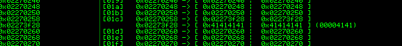 Ok so it seems straight forward, no entries except some at freelist[0] which is normal on creation of a segment and a few allocations. Pressing along, we overflow chunk A with some 0x41's to overflow the chunk, and the adjacent chunks header. With the same data, we will overflow the adjacent chunks flink using 0x44's.