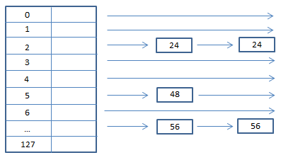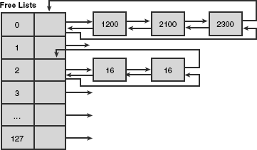 The above diagram shows that the freelist contains an indexed array of heap chunks ranging from 0-128. Any chunk sizes between 0 and 1016 (its 1016 because the maximum size is 1024 - 8 bytes of metadata) are stored according to their allocated unit size * 8. For example, say that I have a chunk of 40 bytes to free, then I would place the chunk at index 4 of the freelist (40/8).