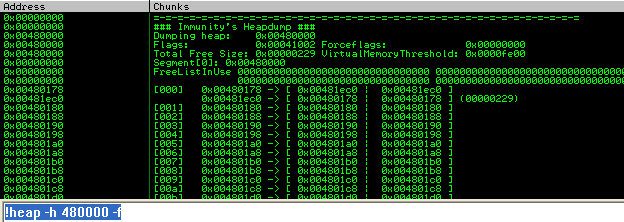 Finally, you can dump some meta data regarding the heap using the -h and -q flag in Immunity Debugger.