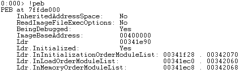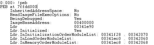 Using Windbg we can find the current PEB by using !peb. If you are a Immunity Debugger user, you can also view this information by using !peb. The very simple code provided for !peb is below.