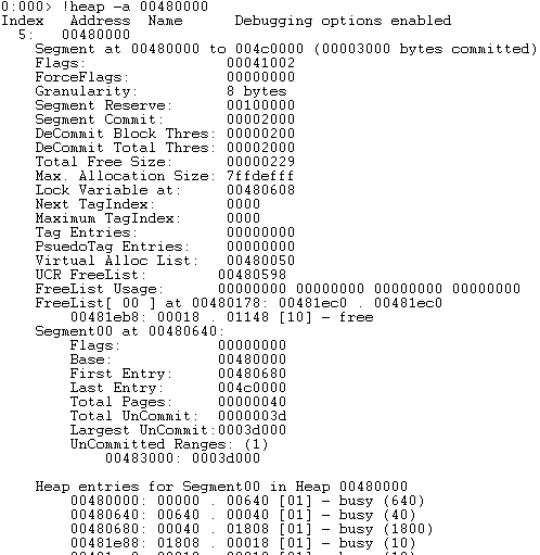 _HEAP 00030000 Segments 00000002 Reserved bytes 00110000 Committed bytes 00014000 VirtAllocBlocks 00000000 VirtAlloc bytes 00000000
