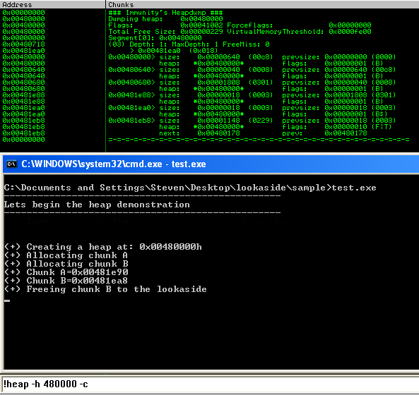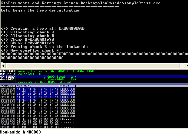 The idea is to build a 'PoC' exploit that will trigger and layout the heap in the right way so that you can overwrite a chunk on the lookaside and gain code execution. Download this (b33f: File not available) file and run it under windows XP SP 3 and try the examples provided here to help you grasp the concept of this technique. I have decided not to share the source code for now so that people will have to do some reverse engineering in order to find the right way to layout the heap and trigger code execution. As a hint (hopefully not too big), here is a screenshot of the 'PoC' code working by determining the heap layout: