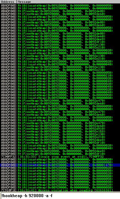 A useful tip to know when debugging applications that contain a heap overflow is the number of allocations and frees and what size they are. During a process/threads life, many allocations and frees are made and it certainly is time intensive to breakpoint all of them. One neat thing with immunity debugger is that you can use the !hookheap plugin to hook RtlAllocateHeap() and RtlFreeHeap() and so you can find the size and number of allocations/frees that are executed during any particular operation.