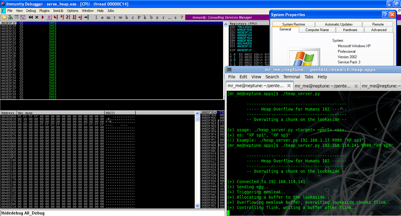 To continue, a somewhat solid understanding of how heap structures work in windows XP/Server 2003 is required. For the purposes of this tutorial alone, and based upon feedback from Heap Overflow for Humans 101, I will discuss some aspects of how the heap internals work under this environment.