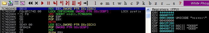 7C910451 > 64:A1 18000000 MOV EAX,DWORD PTR FS:[18] 7C910457 8B40 30 MOV EAX,DWORD PTR DS:[EAX+30] 7C91045A FF70 1C PUSH DWORD PTR DS:[EAX+1C] 7C91045D FF50 24 CALL DWORD PTR DS:[EAX+24] 7C910460 C3 RETN