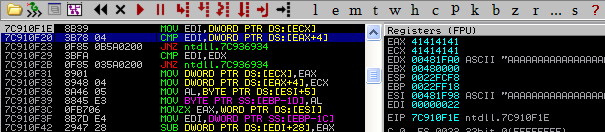 7C91040D > 6A 18 PUSH 18 7C91040F 68 4004917C PUSH ntdll.7C910440 7C910414 E8 B2E4FFFF CALL ntdll.7C90E8CB 7C910419 64:A1 18000000 MOV EAX,DWORD PTR FS:[18] 7C91041F 8B40 30 MOV EAX,DWORD PTR DS:[EAX+30] 7C910422 8945 E0 MOV DWORD PTR SS:[EBP-20],EAX 7C910425 8B48 20 MOV ECX,DWORD PTR DS:[EAX+20] 7C910428 894D E4 MOV DWORD PTR SS:[EBP-1C],ECX 7C91042B 8365 FC 00 AND DWORD PTR SS:[EBP-4],0 7C91042F FF70 1C PUSH DWORD PTR DS:[EAX+1C] 7C910432 FF55 E4 CALL DWORD PTR SS:[EBP-1C] 7C910435 834D FC FF OR DWORD PTR SS:[EBP-4],FFFFFFFF 7C910439 E8 C8E4FFFF CALL ntdll.7C90E906 7C91043E C3 RETN