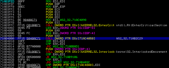 This article would not be complete unless I provided an example of exploiting this vulnerability using an application specific pointer under Windows XP SP3. When targeting software that contains a heap overflow, any hard-coded function call that can be written to and is executed after the overflow's occurrence too should be targeted and abused. Take for example, WSACleanup() from winsock, it contains a hardcoded function call at 0x71ab400a under XP SP3. This can be used as a location in memory that we can write our shellcode too. That way when the WSACleanup() (or many other winsock functions) are executed, it will redirect back to shellcode. Below is the disassembly of WSACleanup() and finding the hardcoded function call.