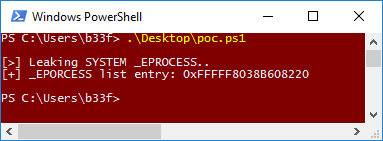 echo "[+] PowerShell _EPORCESS address: 0x$("{0:X}" -f $NextProcess)"