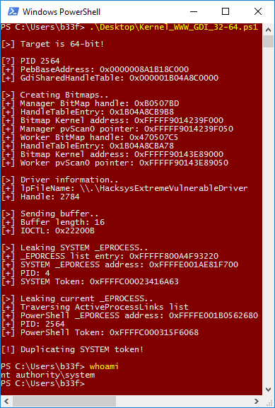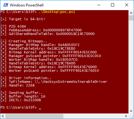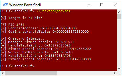 That's the easy part done. What we want to do now is turn a single arbitrary write into a full ring0 read/write primitive. At a high level we will (1) create two bitmap objects, (2) leak their respective kernel addresses, (3) use our arbitrary write to modify a header element for one of the bitmap objects and (4) use the the Gdi32 GetBitmapBits/SetBitmapBits API calls to read from and write to kernel space!