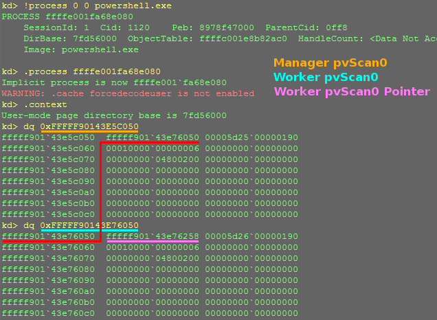 Sw33t! For our ring0 primitive we need to collect this information programmatically for two bitmaps (a manager and a worker). As we were able to see, it's just some simple math based on the bitmap handle. The only question is how do we get the base address for the process PEB. Fortunately the undocumented, NtQueryInformationProcess function comes to the rescue. When called with the ProcessBasicInformation class (0x0), the function returns a struct which contains the base address of the PEB. I won't go into further detail on this as it is a well understood technique, hopefully the POC below will clear up any doubts!